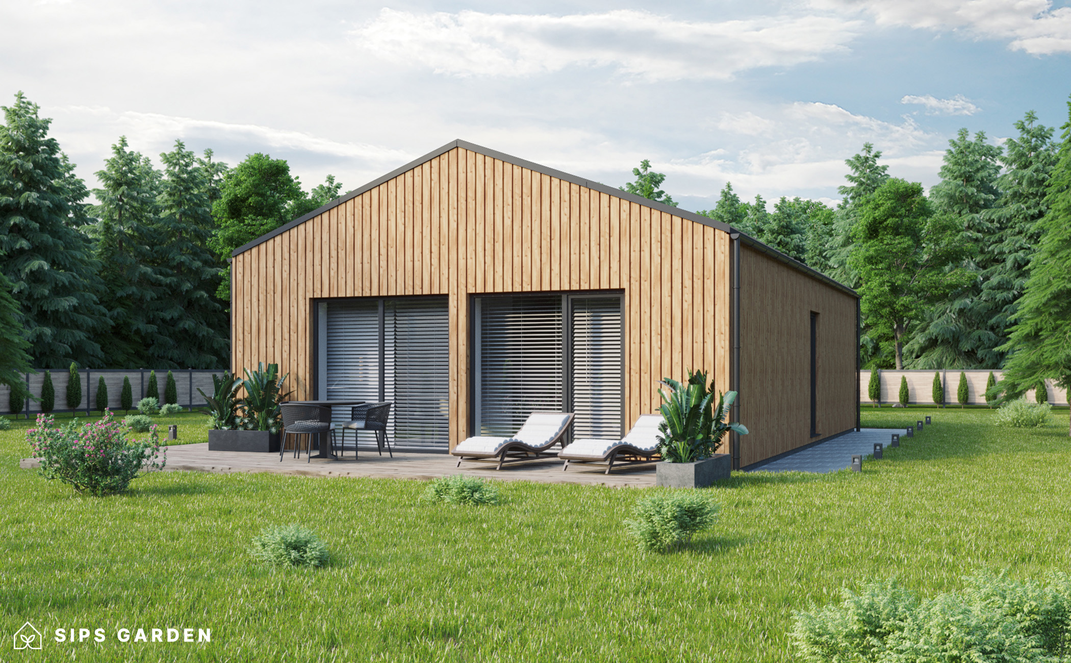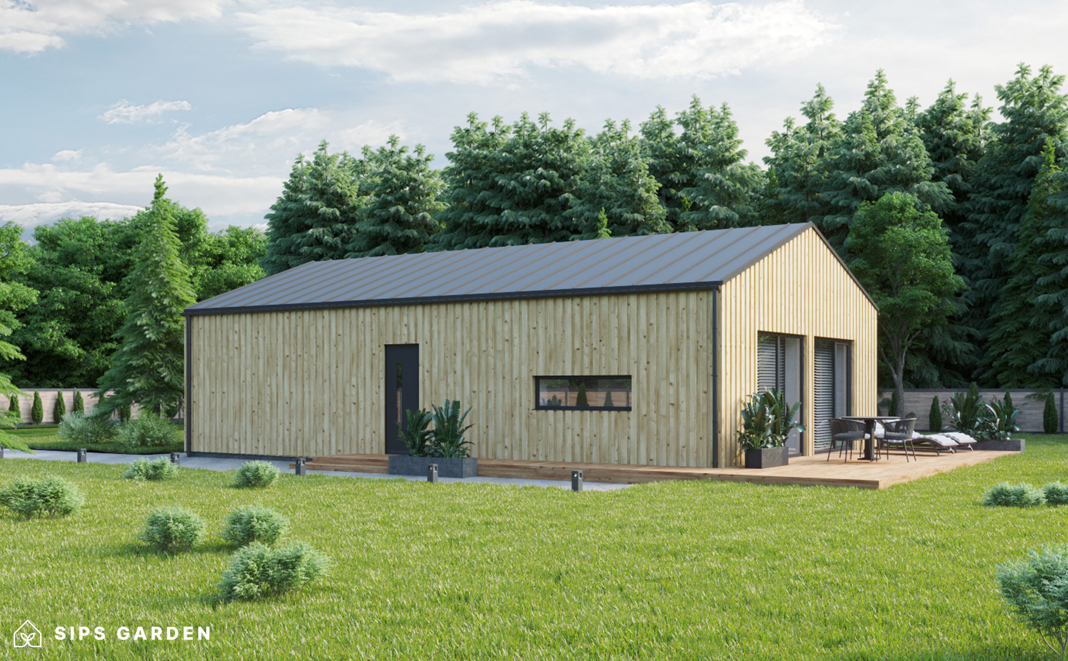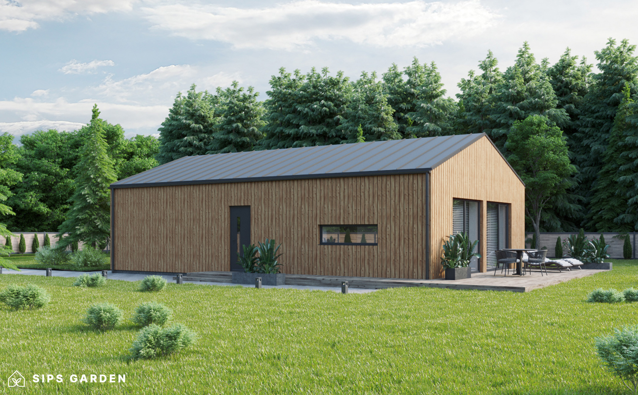 Este producto está fabricado con un avanzado sistema SIP (siglas en ingles, Paneles Aislantes Estructurales) de alta calidad y eficiencia energética, que garantiza un aislamiento superior y una larga durabilidad. El exterior cuenta con ventanas y puertas de doble acristalamiento de PVC de color gris antracita, complementadas con una cubierta de tejado de EPDM, un resistente canalón de acero para la lluvia y elegantes detalles de acabado de acero, todos ellos incluidos como elementos estándar.