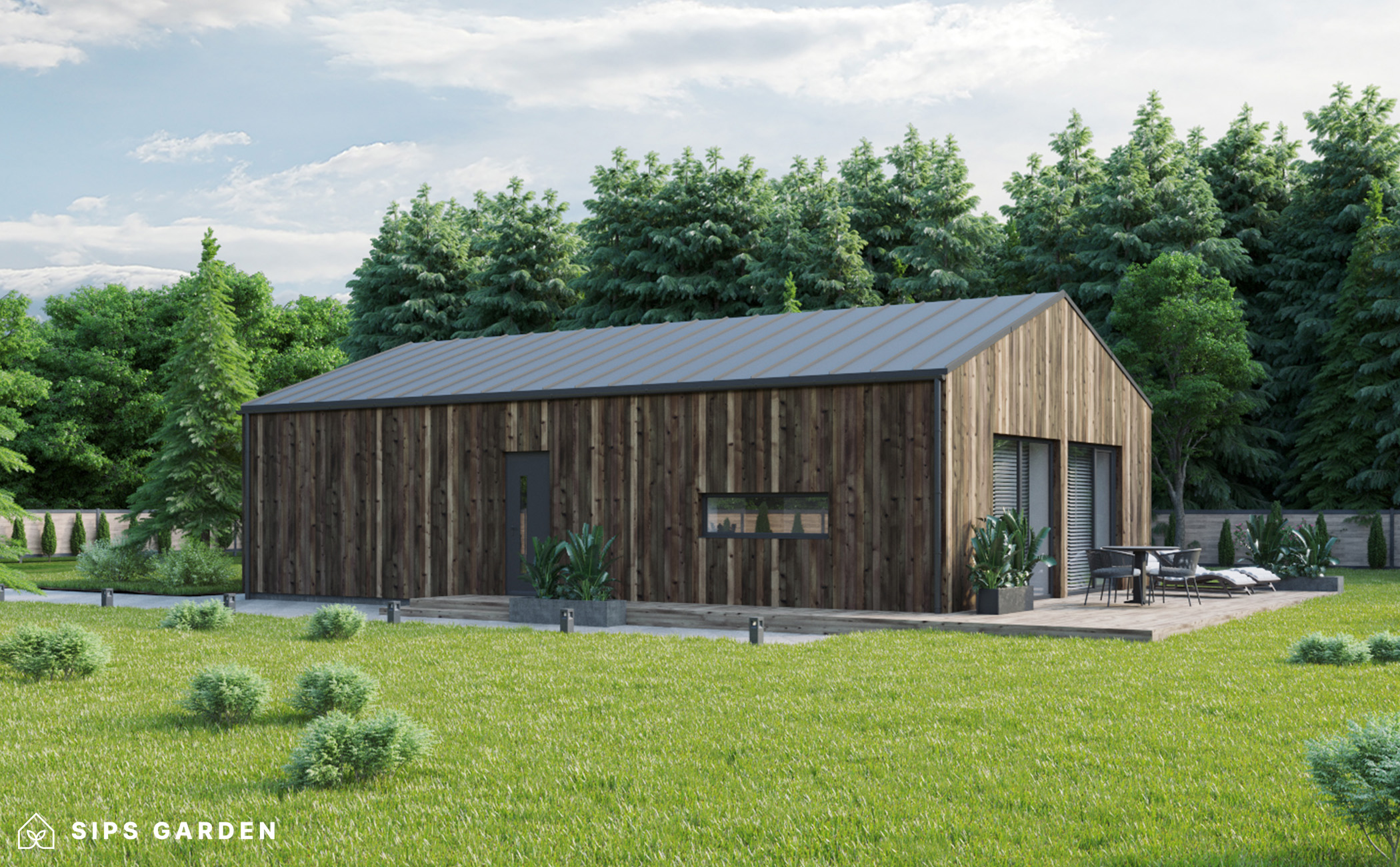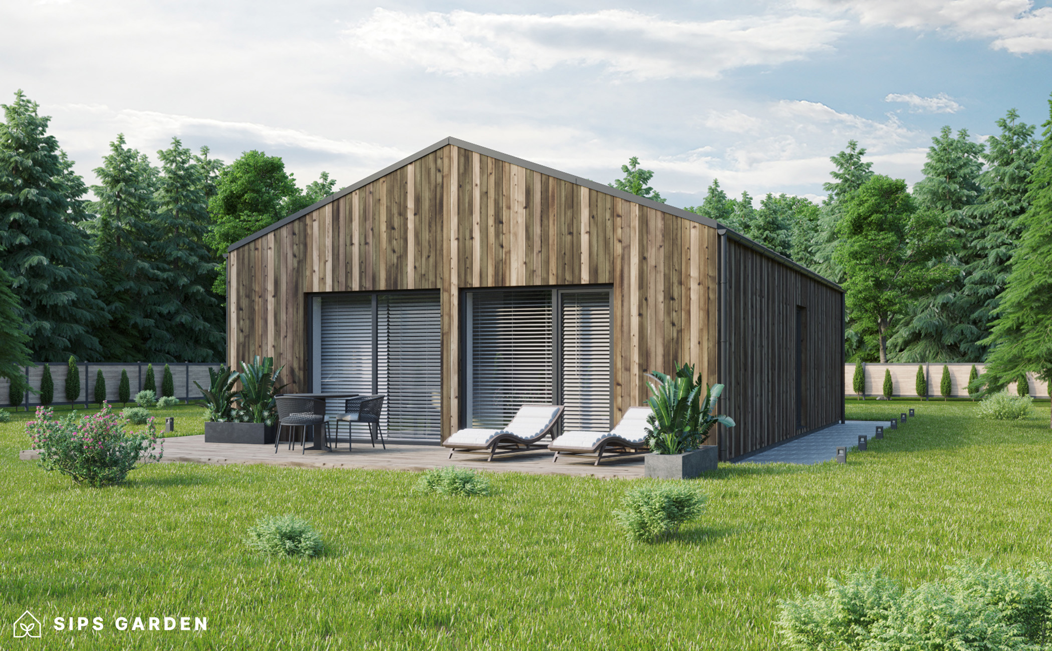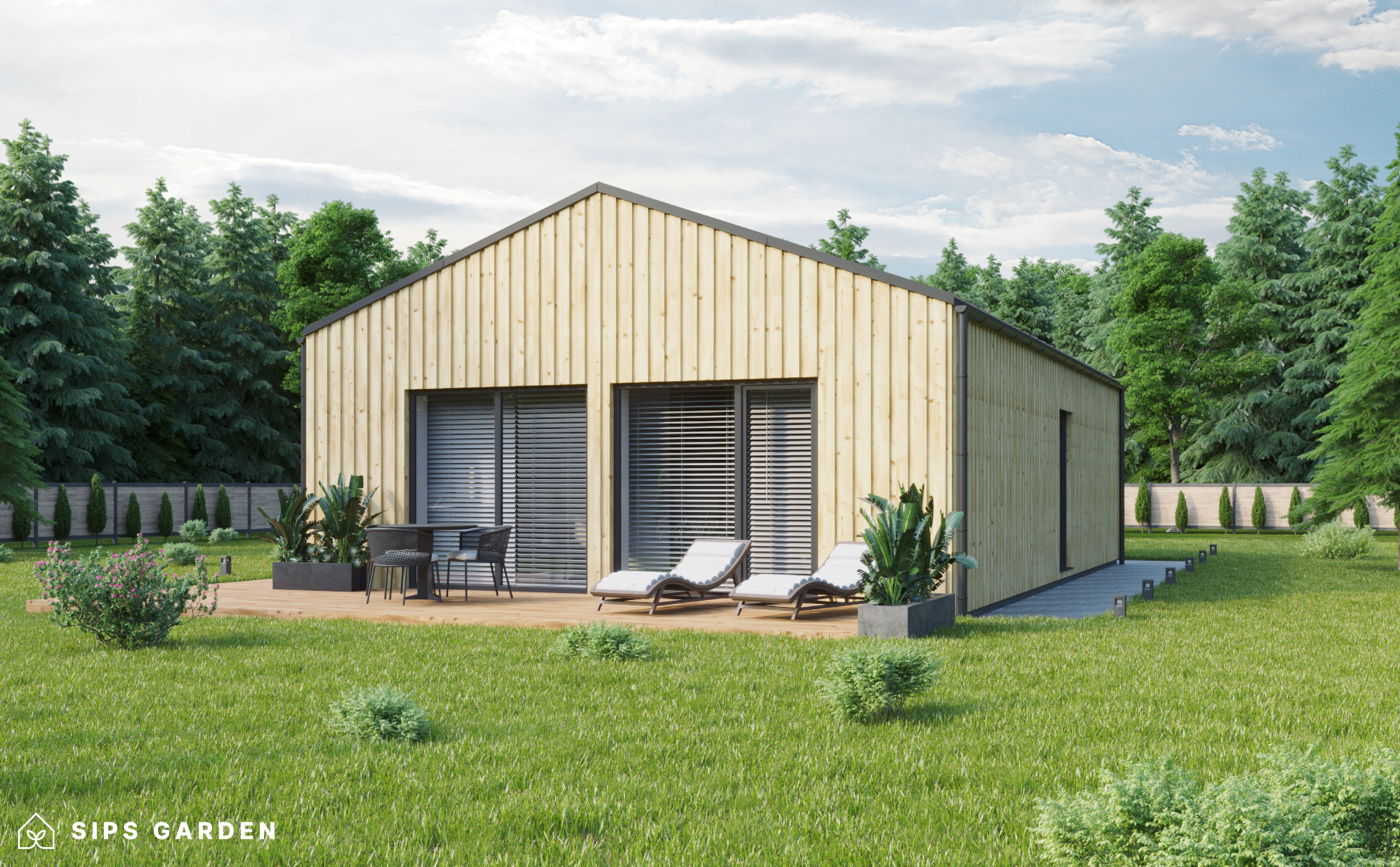 Este producto está fabricado con un avanzado sistema SIP (siglas en ingles, Paneles Aislantes Estructurales) de alta calidad y eficiencia energética, que garantiza un aislamiento superior y una larga durabilidad. El exterior cuenta con ventanas y puertas de doble acristalamiento de PVC de color gris antracita, complementadas con una cubierta de tejado de EPDM, un resistente canalón de acero para la lluvia y elegantes detalles de acabado de acero, todos ellos incluidos como elementos estándar.