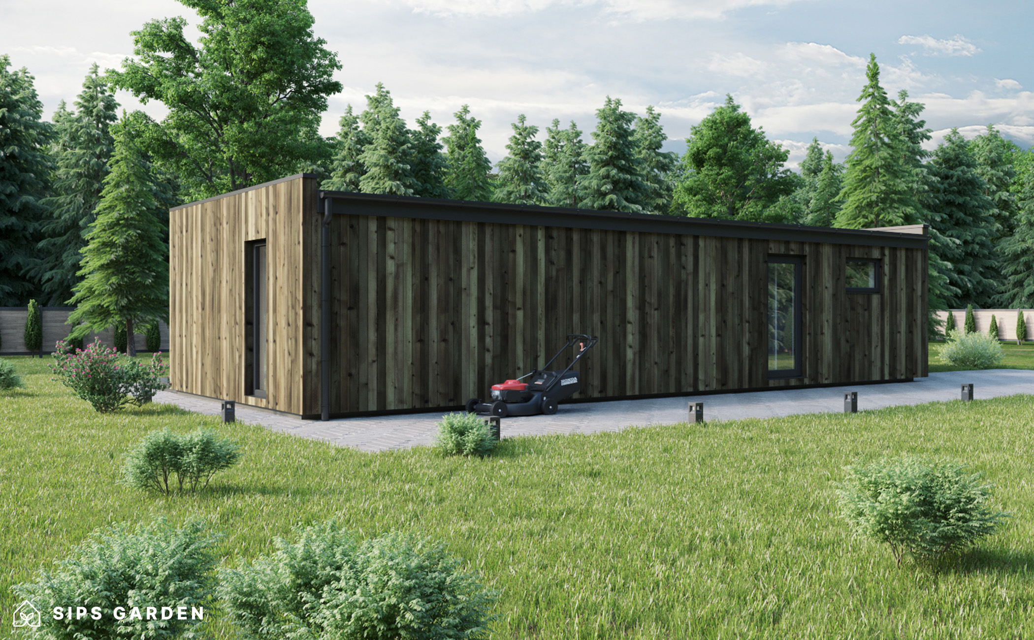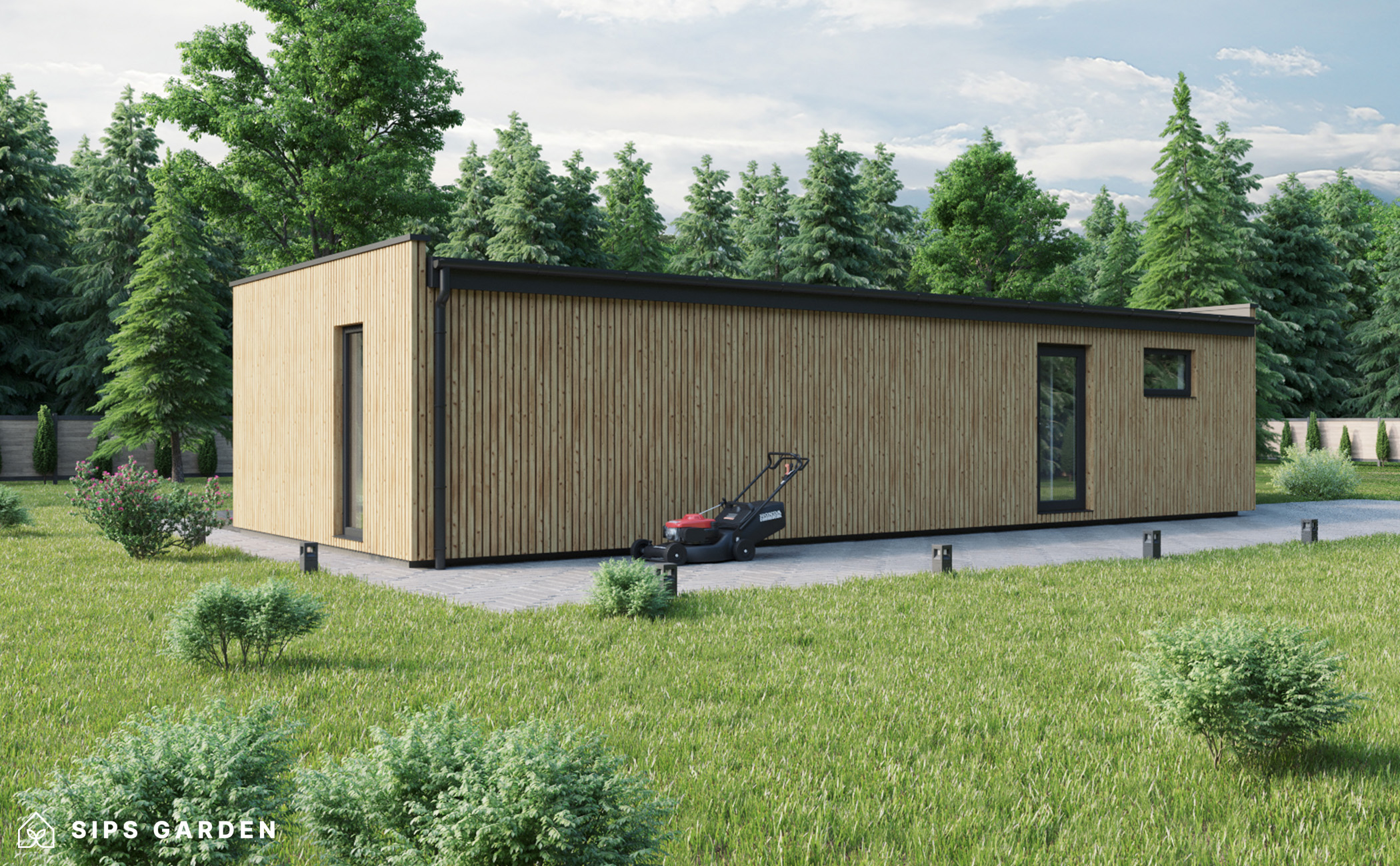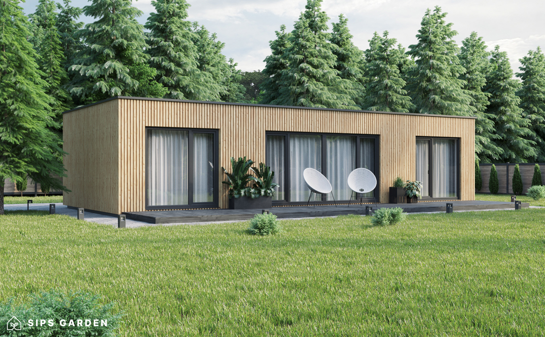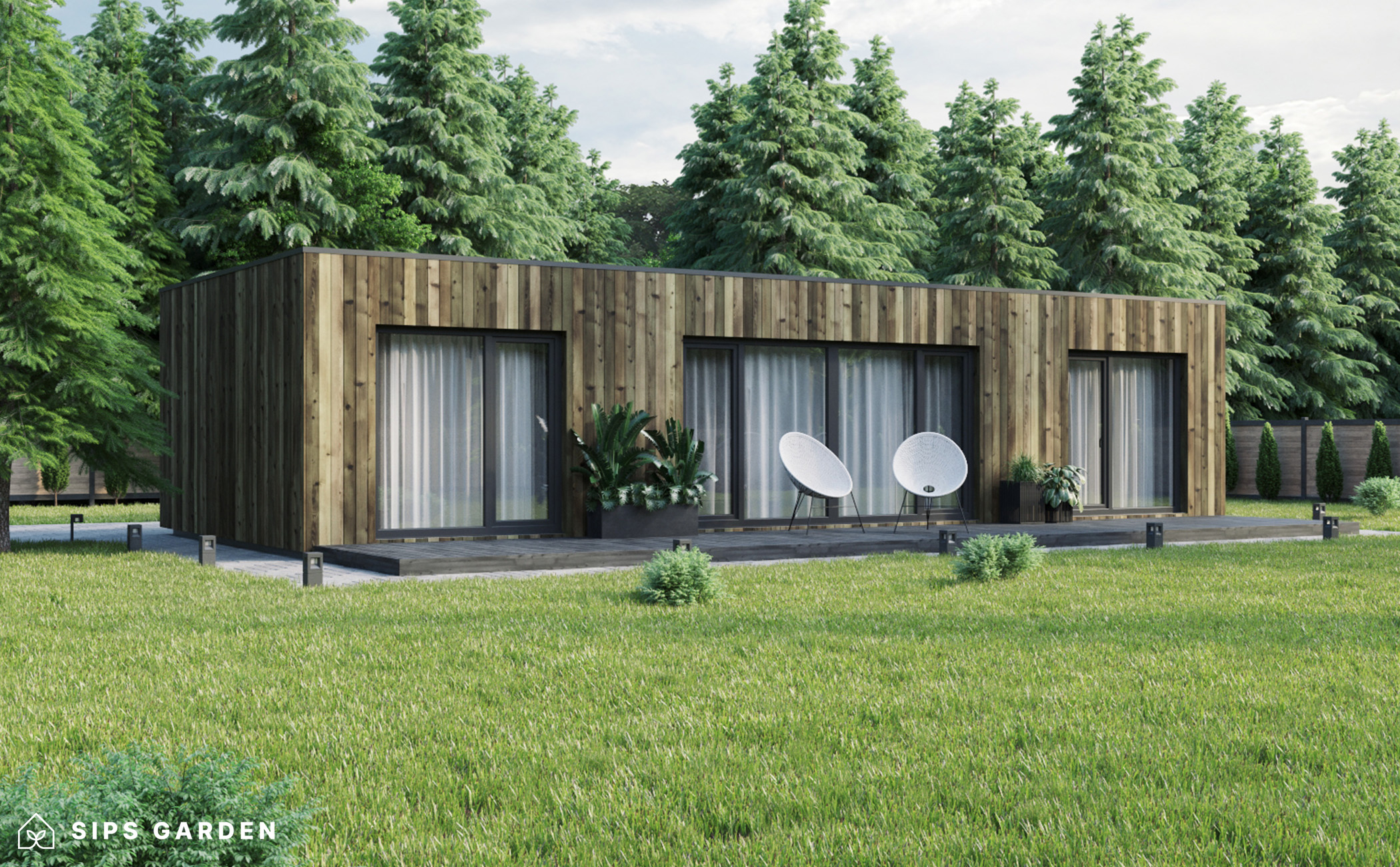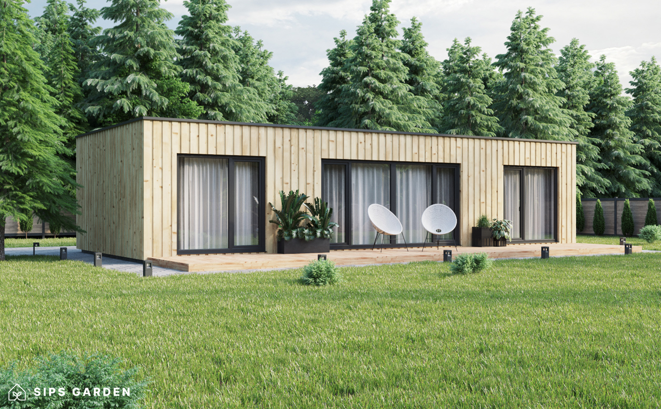 Este producto está fabricado con un avanzado sistema SIP (siglas en ingles, Paneles Aislantes Estructurales) de alta calidad y eficiencia energética, que garantiza un aislamiento superior y una larga durabilidad. El exterior cuenta con ventanas y puertas de doble acristalamiento de PVC de color gris antracita, complementadas con una cubierta de tejado de EPDM, un resistente canalón de acero para la lluvia y elegantes detalles de acabado de acero, todos ellos incluidos como elementos estándar.